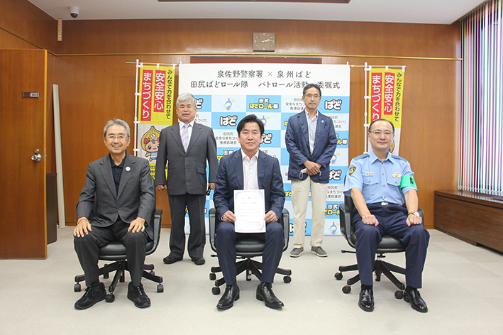 田尻町安全なまちづくり推進協議会会長の栗山 美政 田尻町長をはじめ、副会長の泉佐野警察署長、泉佐野警察署管内防犯協議会副会長、田尻町地区連合会会長が列席し、委嘱状と田尻ぱどロール隊腕章の授与及びぱどんなさんの決意表明が行われました。