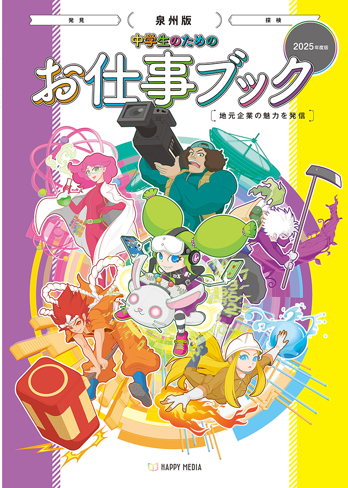 令和7年1月31日に「中学生のためのお仕事ブック」が発行となりました。この本は、泉州地域 の全公立中学校の中学2年生を対象にしており、「小学生のためのお仕事ノート」と同様に地域の企業や店舗について詳細な紹介記事を掲載しています。生徒たちが夢を描くために必要な情報を提供し、地元企業のメッセージを伝えることで、学校、企業、そして生徒の皆さんにとって有益な一冊となるように仕上げています。